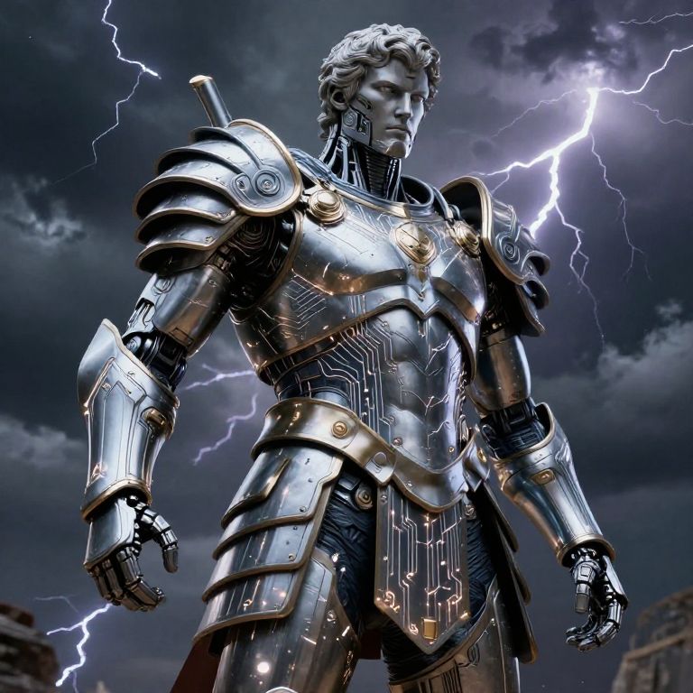 This is a digital CGI image of a futuristic, humanoid robot warrior with a classical Greek statue-like head. The robot is clad in shiny, metallic armor with intricate, glowing circuitry patterns. Its armor includes pauldrons, a chest plate, and greaves, all reflecting light. The background is a dramatic, stormy sky with dark clouds and bright, jagged lightning bolts illuminating the scene. The robot stands in a powerful, heroic pose, with one arm slightly raised, and its expression is stern and determined. The overall color palette includes metallic grays and silvers, contrasted by the dark, electric blue of the stormy sky.