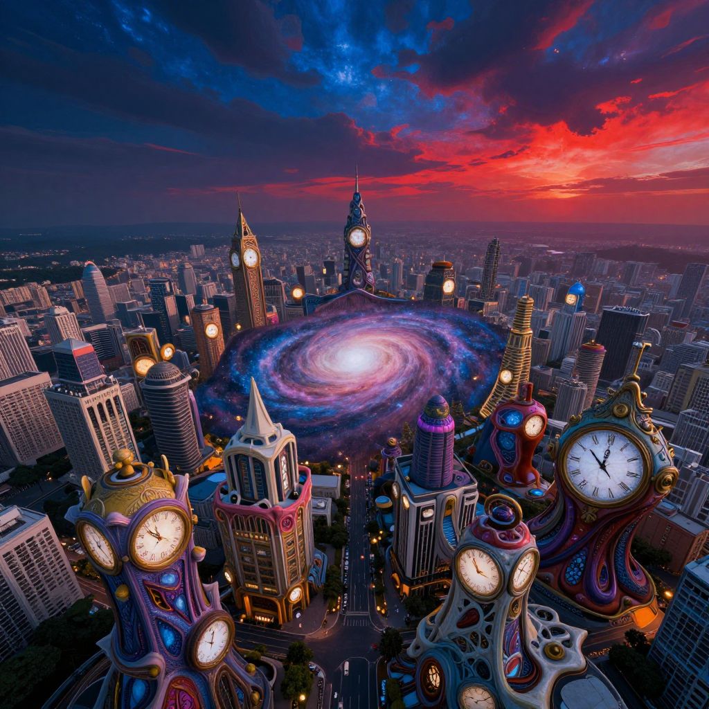 A mesmerizing digital art creation captures our gaze with a surreal landscape where melting timepieces intertwine with swirling galaxies. From an aerial viewpoint, we observe a sprawling, vibrant metropolis in which buildings transition into organic forms, embellished with intricate clock faces that flicker and transform. The sky above is painted with bold strokes of deep blues and fiery reds, evoking an emotional gradient that combines wonder and unease. As the camera sweeps across this fantastical scene, it invites us into a captivating dance between order and chaos, logic and madness - a tribute to the boundless potential of human imagination.
