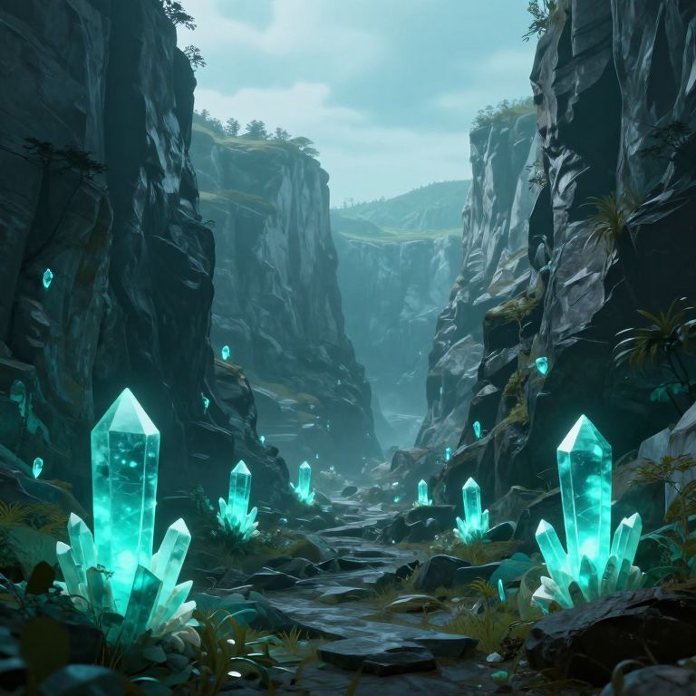 Digital fantasy artwork of a mystical canyon with glowing, turquoise crystals scattered among dark, rocky cliffs under a cloudy, blue sky.