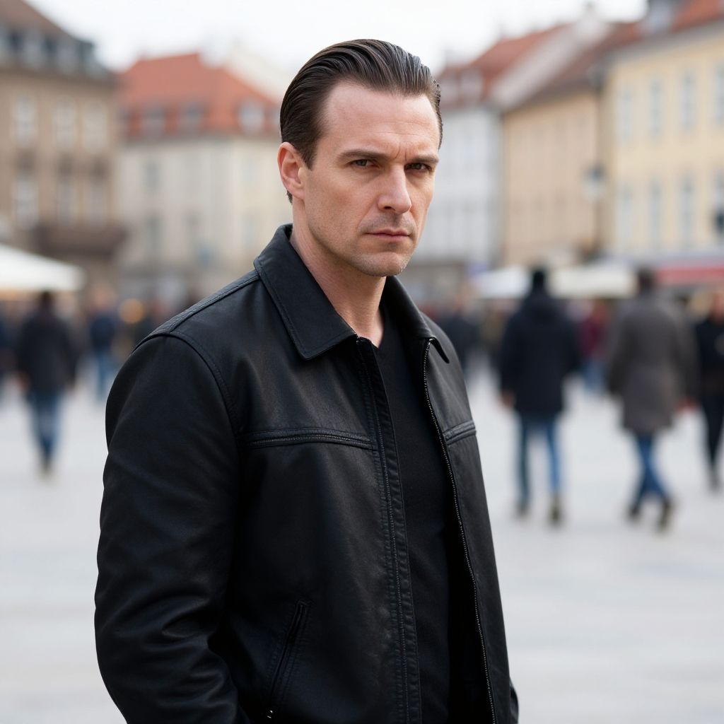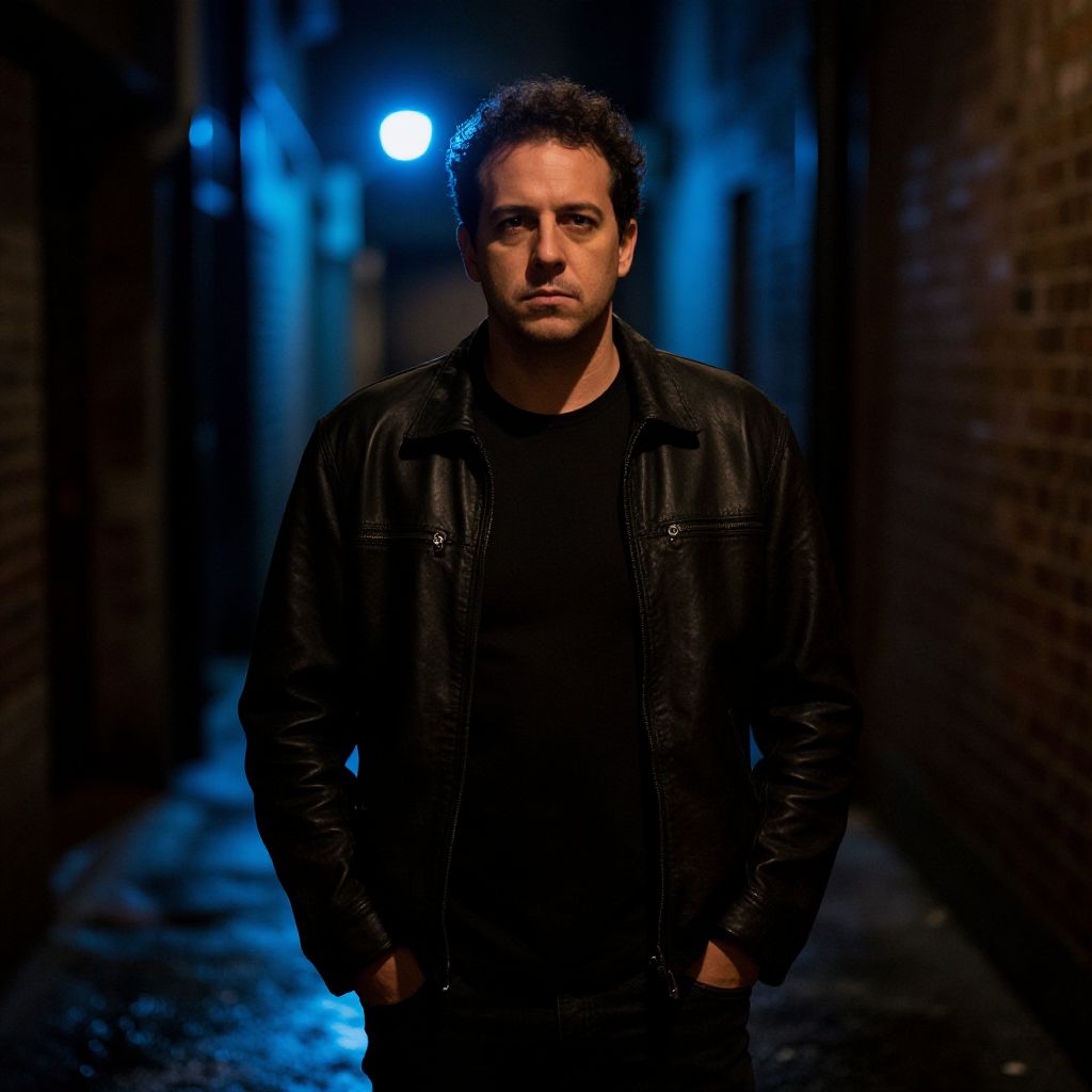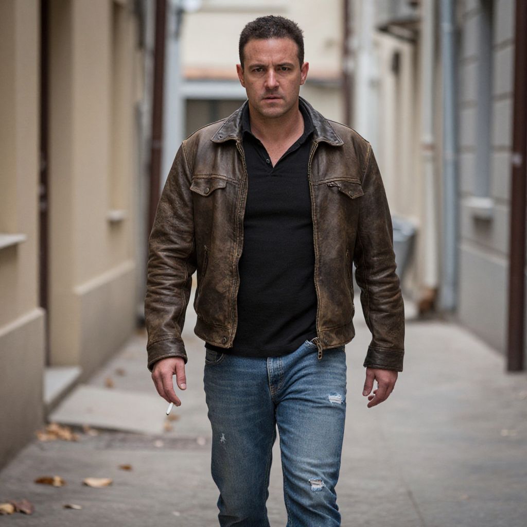 Photograph of a tough-looking man walking down a narrow, urban alley. He has short, dark hair and a serious expression. He's wearing a worn, brown leather jacket over a black shirt and ripped blue jeans. He holds a cigarette in his right hand. The alley is lined with beige and gray buildings, with fallen leaves scattered on the ground. The photo has a slightly gritty, realistic style.