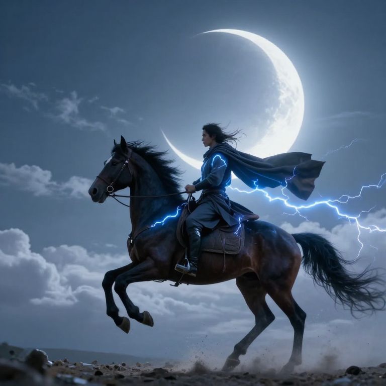 Digital artwork of a dark-haired warrior riding a galloping black horse, illuminated by a glowing blue crescent moon and lightning, against a cloudy night