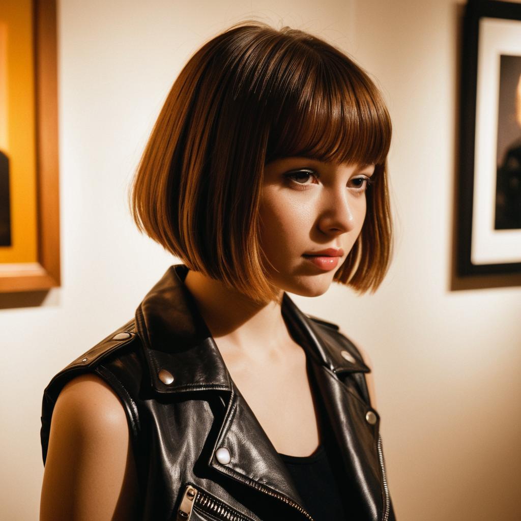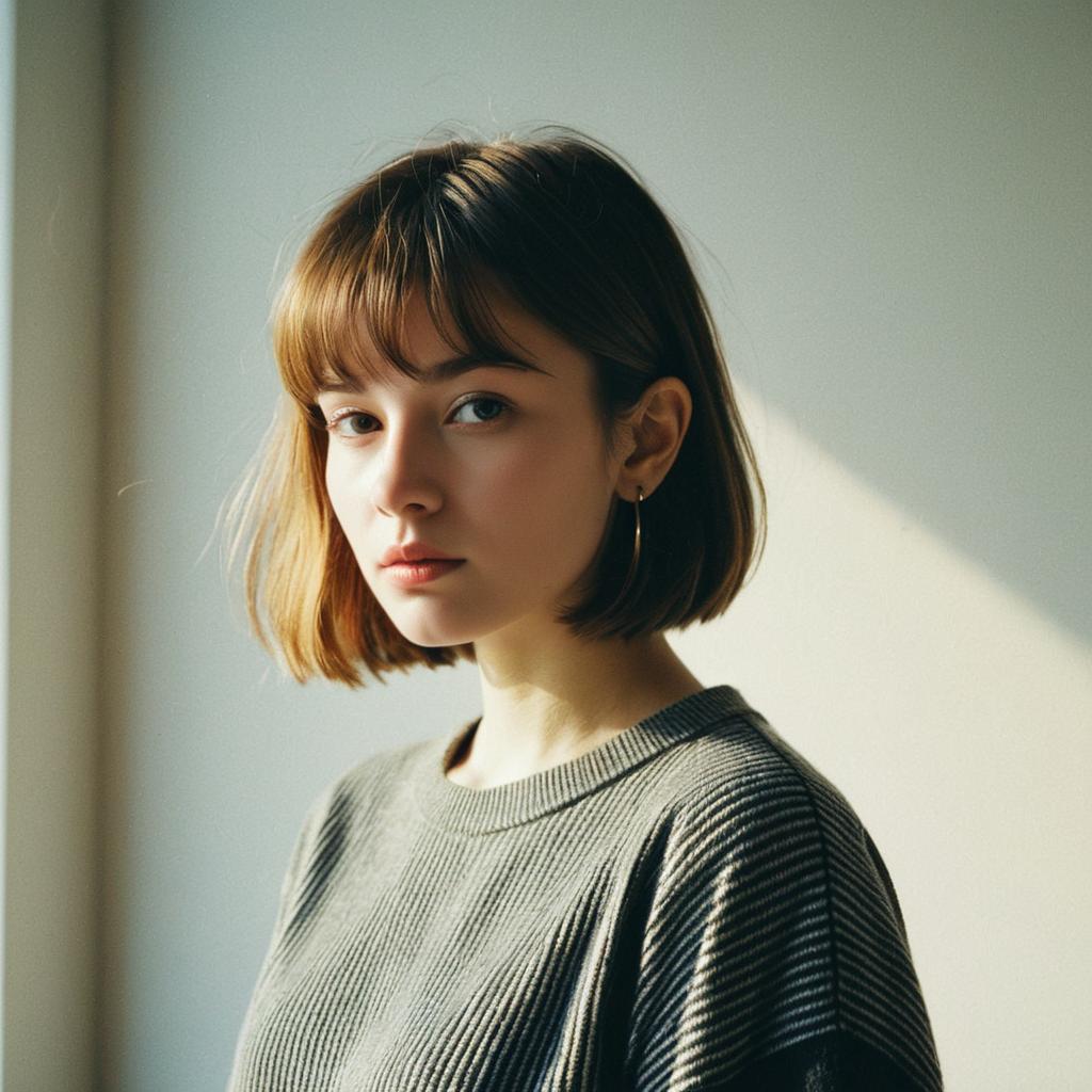 Ear-Length Bob hairstyle on fashion model, wearing casual outfit, in studio, captured in fashion editorial style with golden hour backlight.
