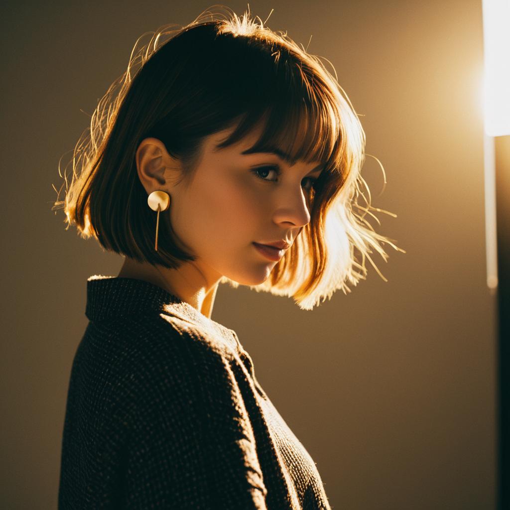 Close-up portrait of a young woman with an ear-length bob hairstyle, showcasing soft waves and bangs. She is wearing a dark, textured casual outfit and a pair of unique gold earrings. The image is taken in a studio setting with golden hour backlight creating a warm, glowing ambiance highlighting the hair and profile.