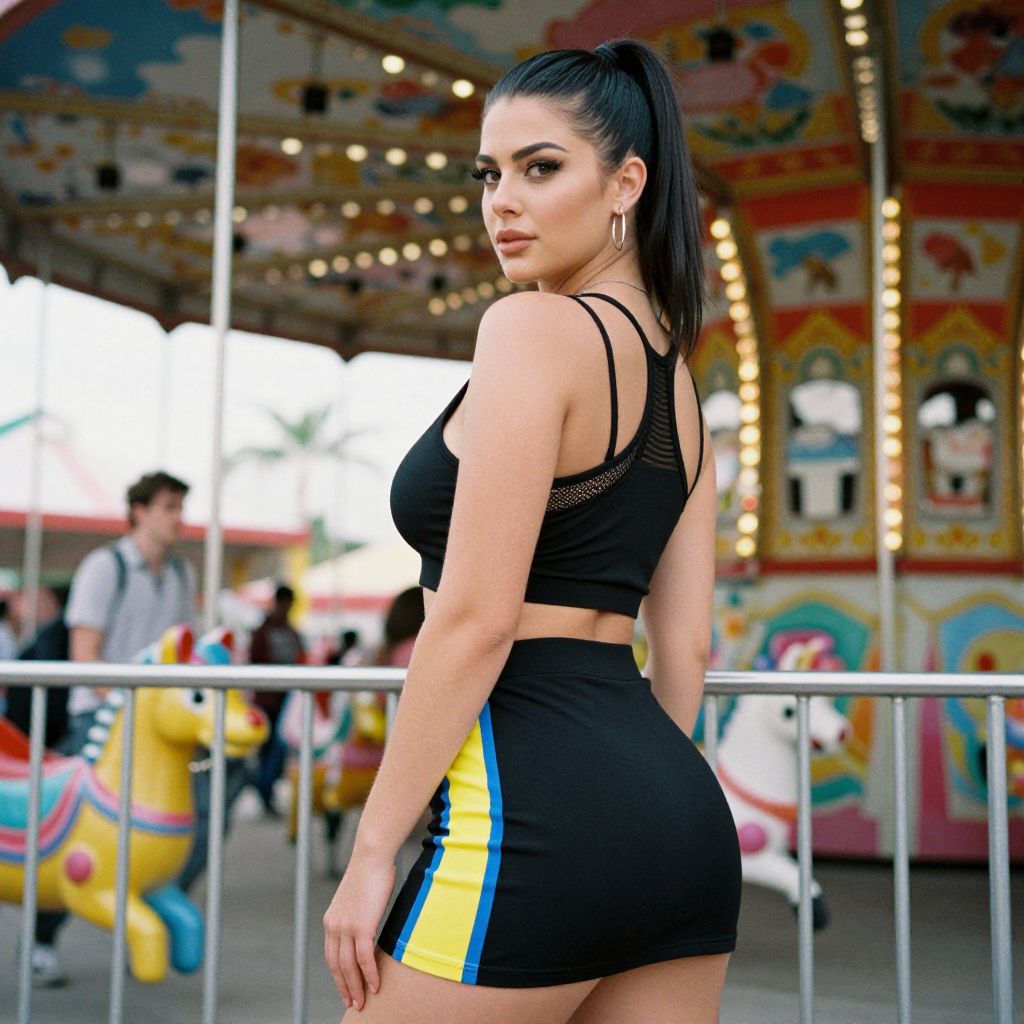 A toned woman, sporty chic, in a black crop top with thin straps, racer-back, mesh panel, yellow and blue stripes, matching mini skirt with side slit, same yellow and blue stripes, athletic fabric, hoop earrings, slick high ponytail, near a colorful carnival ride, captured in medium format film style, enjoying the vibrant atmosphere and excitement. Sexy. Pretty face and beаutiful eyes. Big breasts
