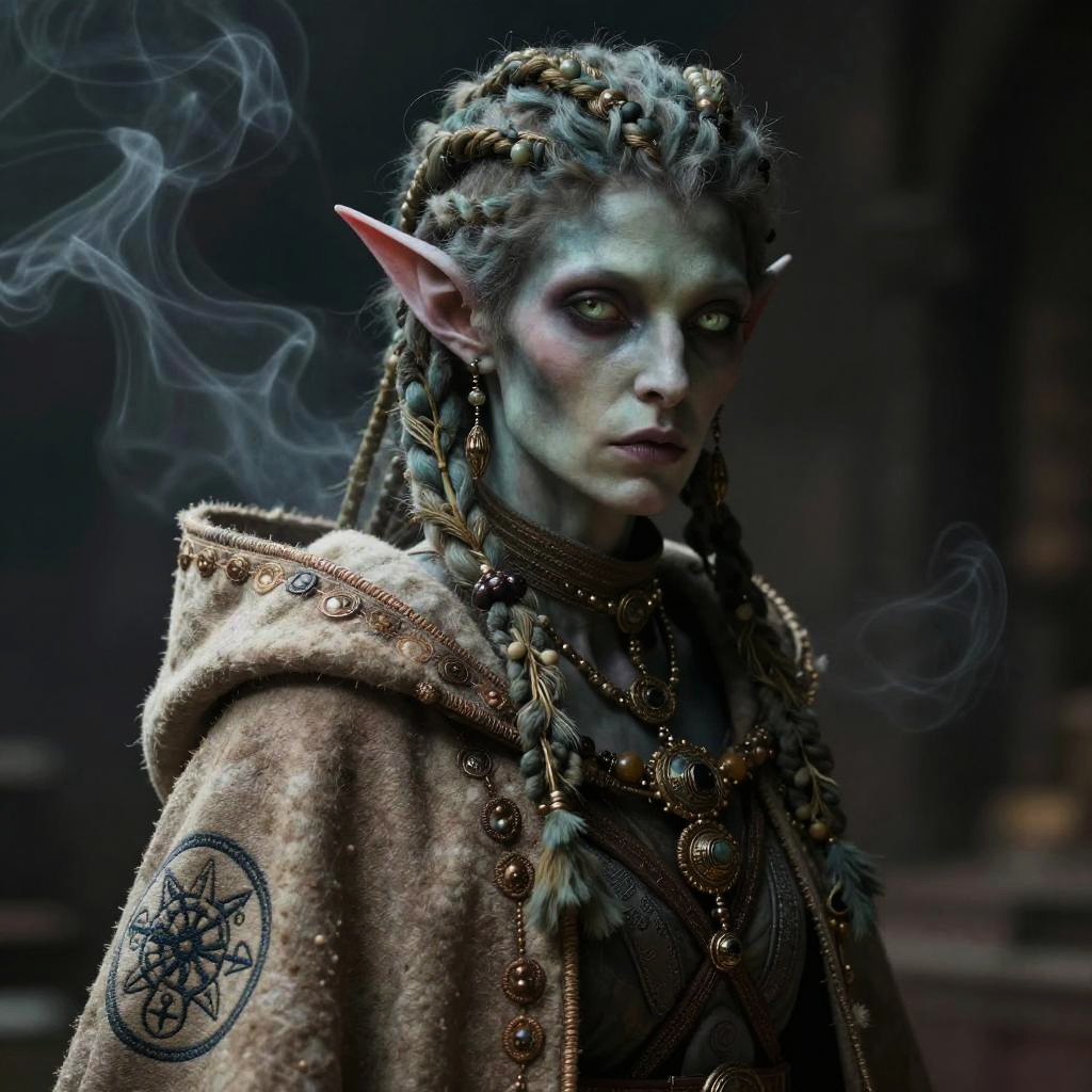 Arcane scholar of the lost library, with short hair braided with beads and vines, elongated pointed ears, glowing eyes, pale green skin, surrounded by dark ethereal smoke, wearing dusty embroidered scholar's cloak with mystical symbols, detailed and atmospheric