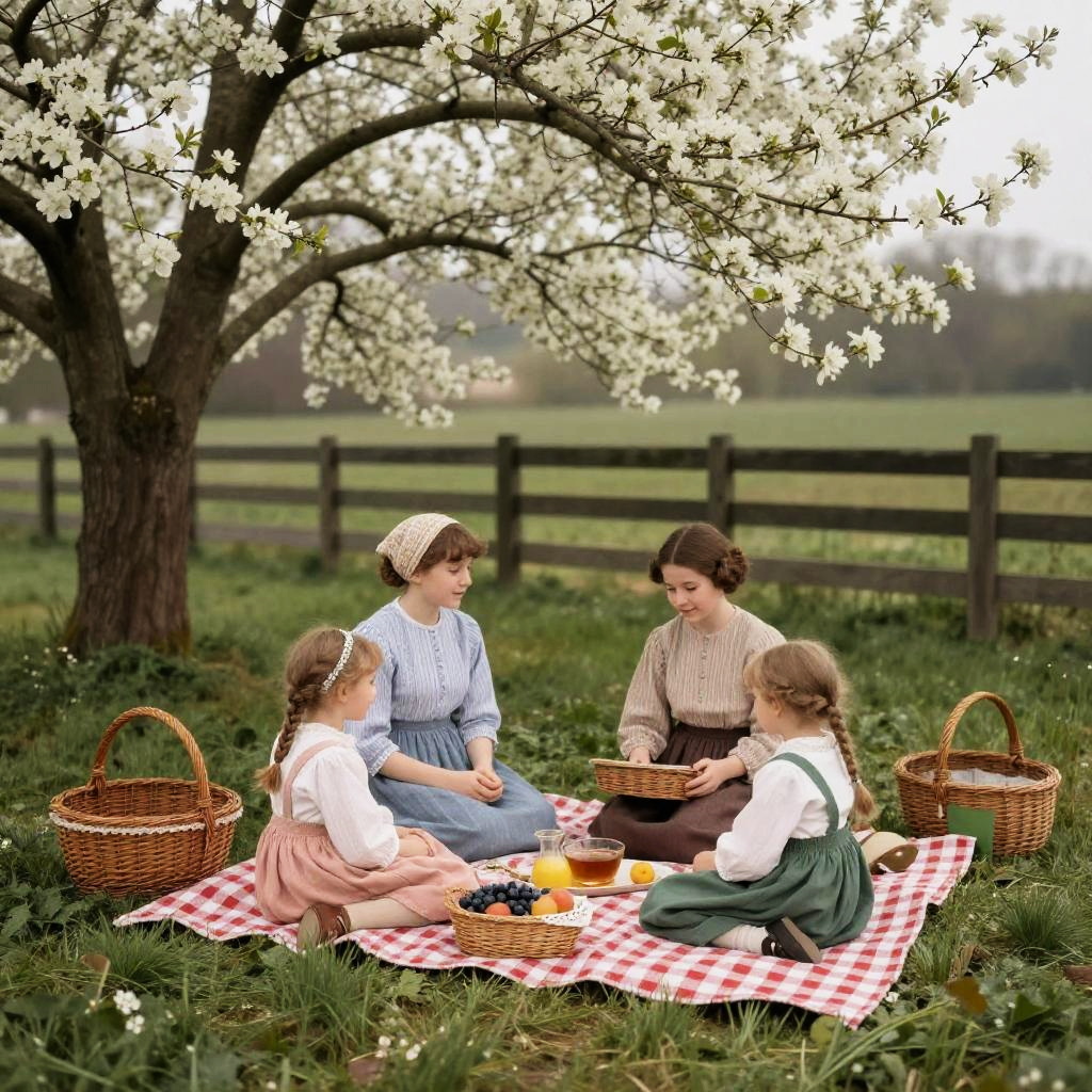 1910s countryside picnic scene with families dressed in traditional clothing, checkered blankets, vintage wicker baskets with food, blossoming trees and a classic wooden fence, peaceful and vibrant spring atmosphere