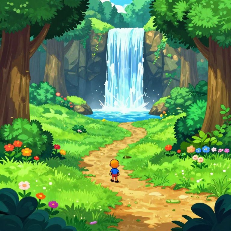 A vibrant digital illustration reminiscent of classic JRPG aesthetics, featuring a whimsical forest path leading to a serene waterfall, with a small character exploring amidst lush greenery and colorful flowers, capturing the nostalgic charm of titles like *Trials of Mana*.