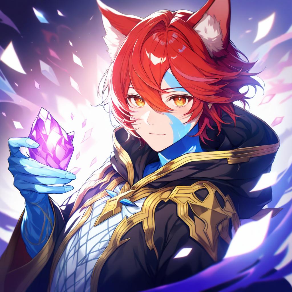 Crystal exarch, final fantasy, 1boy, cat boy, cat ears, red eyes, hair between eyes, slit pupils, red hair, short hair, hooded robe, black robe, hooded robe, black robe, hood down, miqo'te, material growth, facial mark, crystal, by artist ringozaka mariko, animagine