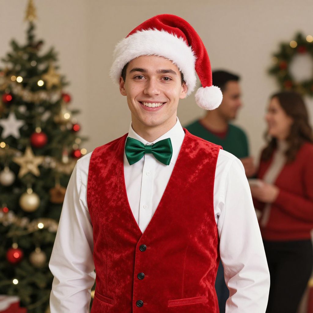 A cheerful young man dressed in a festive red velvet vest, white shirt, green bow tie, and a Santa hat is smiling at a Christmas party. In the background, a decorated Christmas tree and blurred party guests create a warm holiday atmosphere.