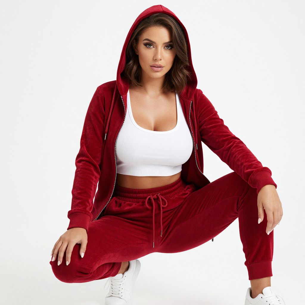 "Woman, sporty casual, red velvet tracksuit, hoodie with full zipper and drawstring, matching red sweatpants with elastic waistband and drawstring, cropped white tank top, white sneakers, white studio background. Sexy. Pretty face and beаutiful eyes. Big breasts."