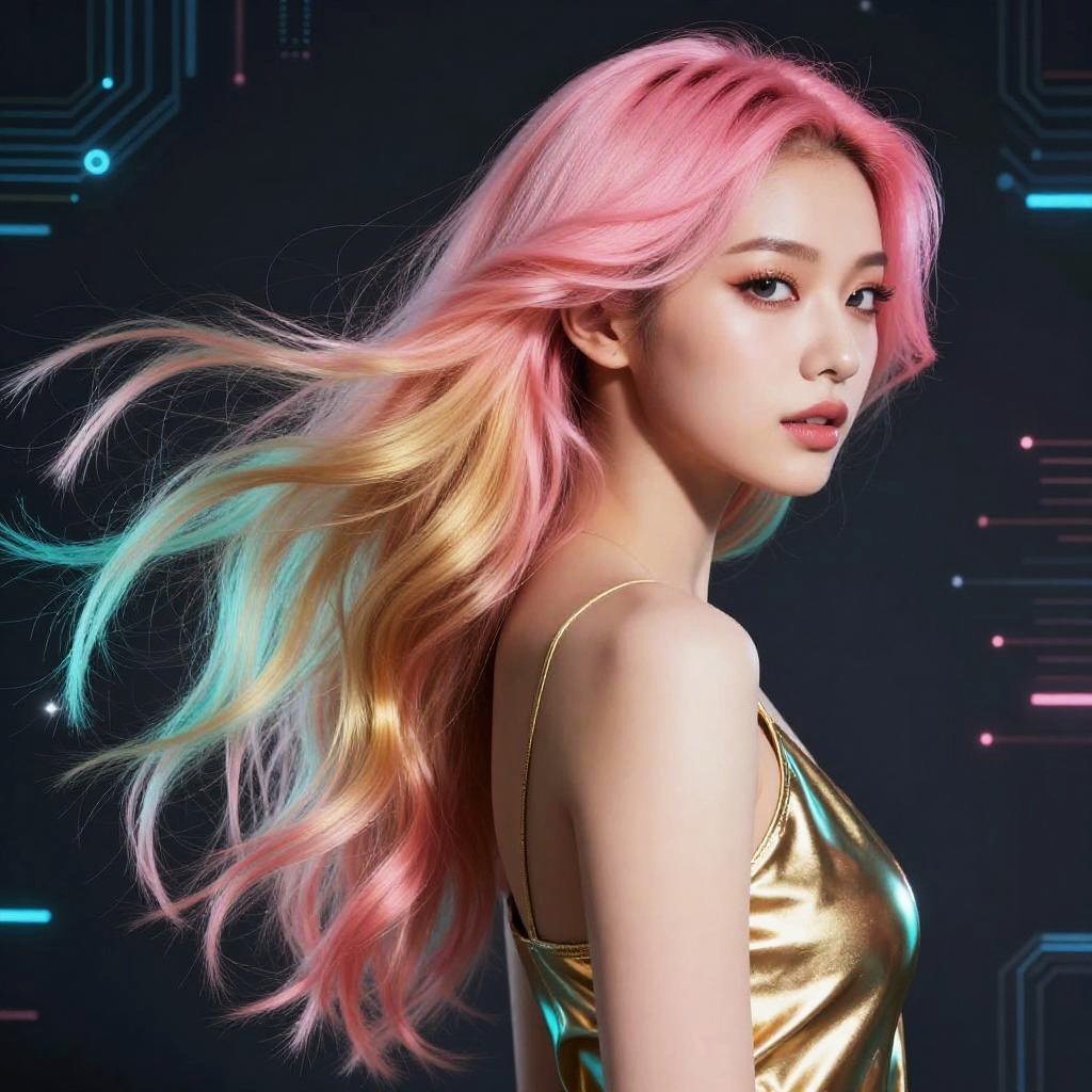 AI hair color transformation, a woman with flowing hair shifting dynamically through vibrant colors like electric pink, teal, and gold, set against a high-tech sci-fi background with circuit patterns and glowing effects