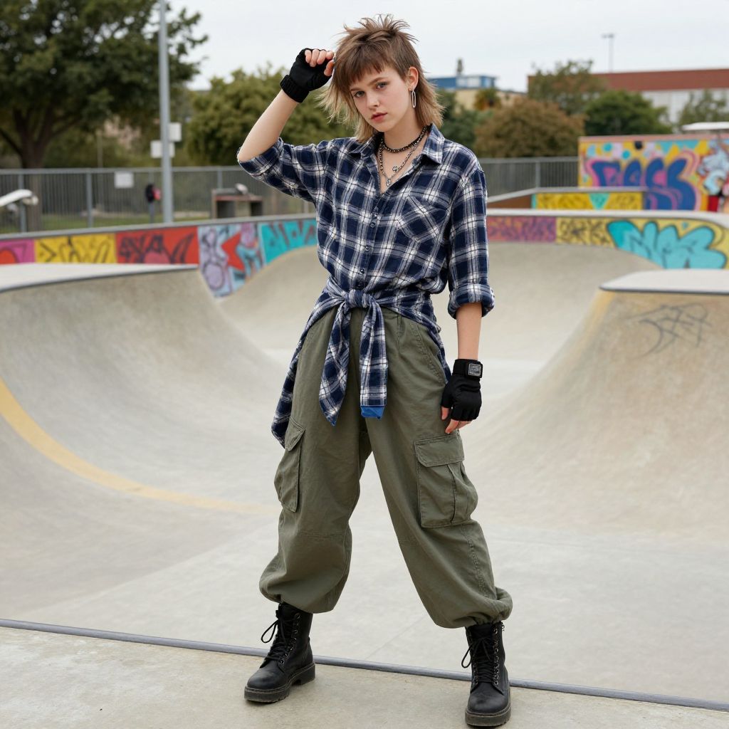 80s tomboy fashion, edgy model wearing loose plaid shirts tied around the waist, baggy cargo pants, chunky boots, and fingerless gloves, styled with a messy mullet haircut, posing confidently in a retro skate park with colorful ramps and graffiti art.