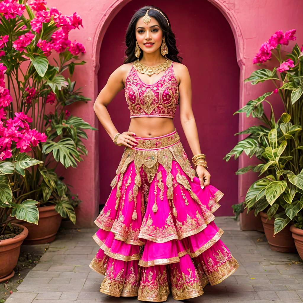 Belly dancer outfit, worn by fusion artist, featuring cropped peplum top with intricate beading and layered ankle-length skirt, in bright pink and metallic gold.