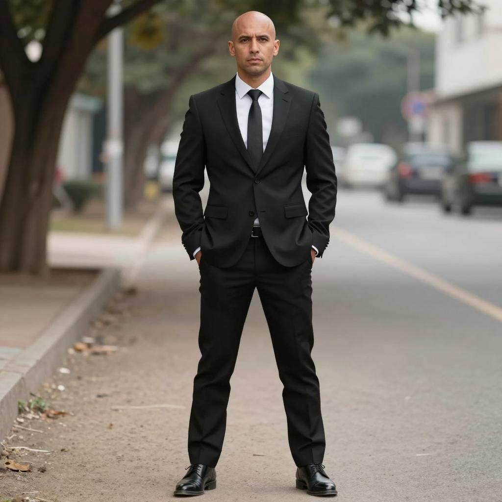 A confident bald man wearing a denim jacket stands in the middle of an urban street, surrounded by brick buildings and parked cars. The photo captures a gritty, realistic street style with a focus on his determined expression and casual American-inspired shirt underneath.