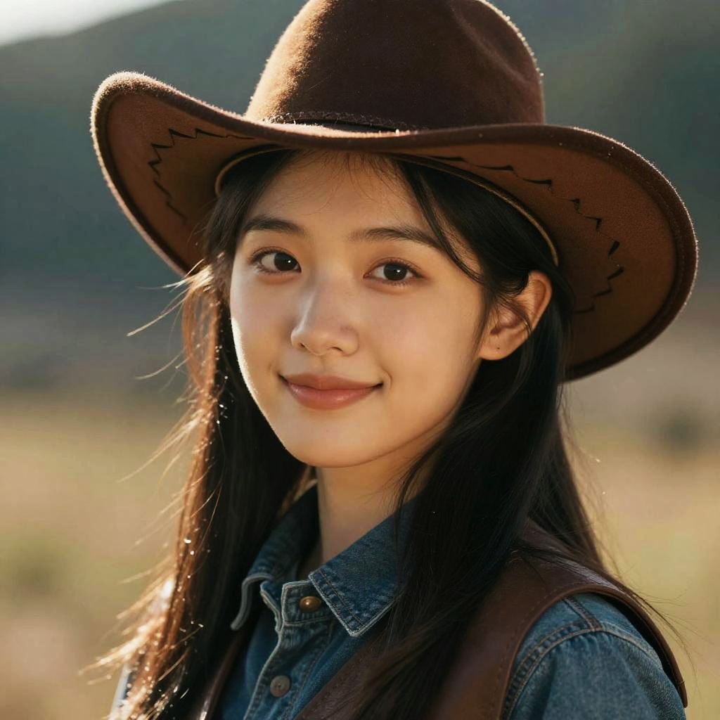 Portrait of a young East Asian woman wearing a brown cowboy hat and denim jacket smiling gently at the camera. The photo is taken outdoors with natural light, highlighting her clear skin and dark hair. The image has a soft background blur with hints of a rural or natural landscape.