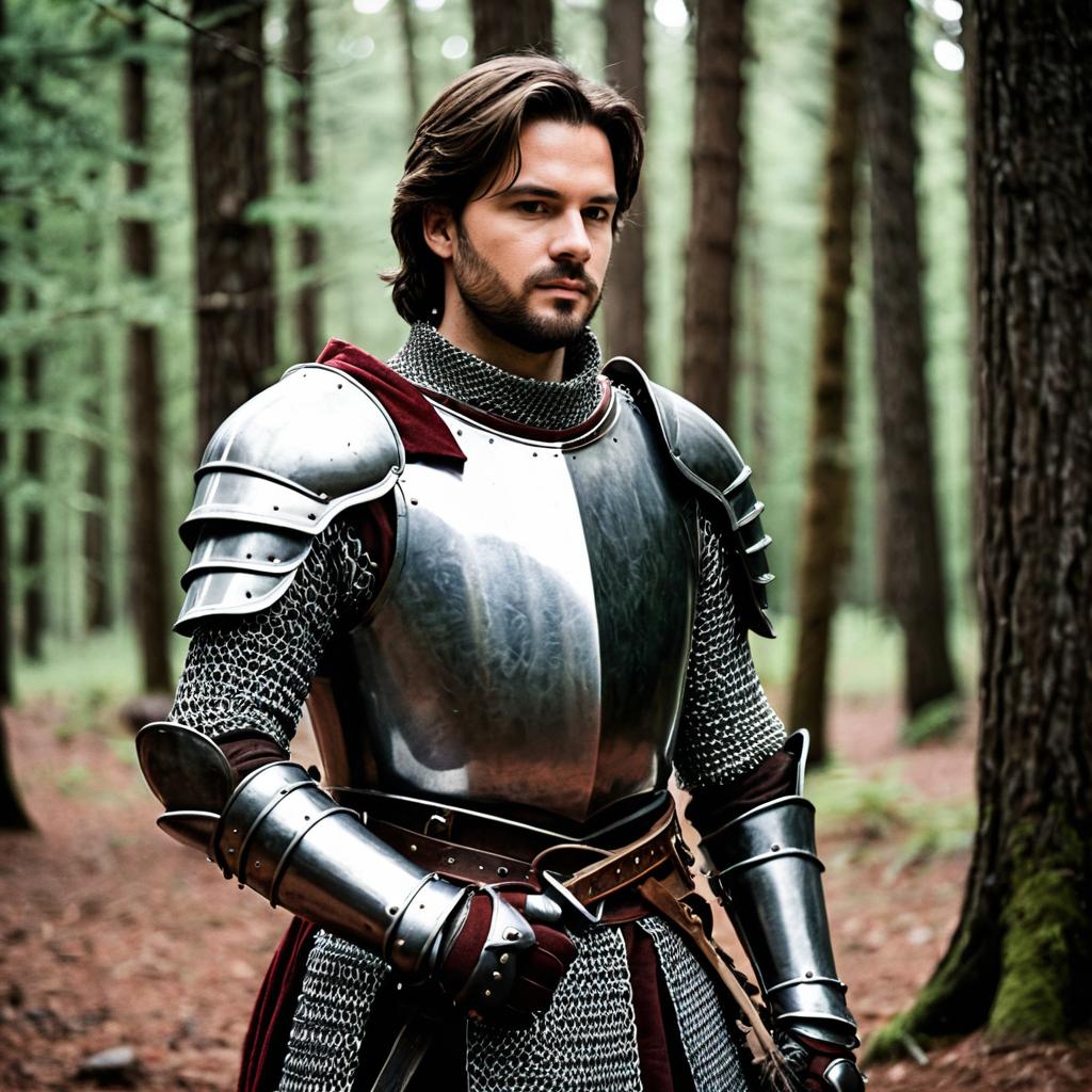Medieval prince attire,1boy, solo, male focus, facial hair, blurry background, realistic, looking at viewer, blurry, belt, brown hair, outdoors, cape, beard, upper body, armor