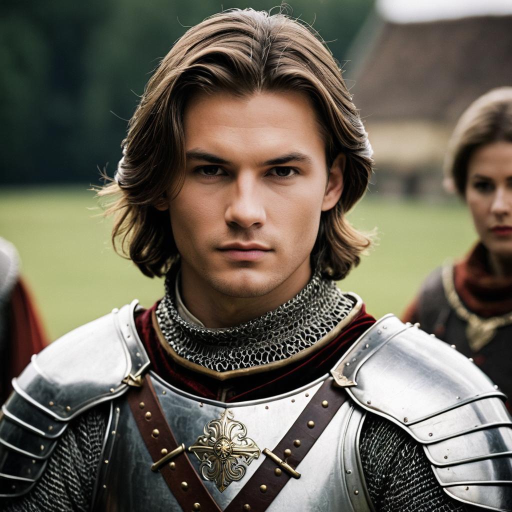 Portrait of a young man dressed as a medieval prince, wearing detailed black and gold armor with a brown fur-lined cape. He has brown hair, a well-groomed beard, and a serious expression. The background shows a blurred medieval castle and greenery, indicating an outdoor setting.