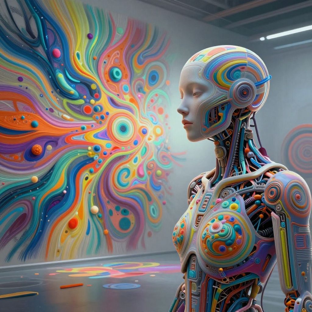Digital art of a cyclist in a brown helmet and jacket riding a vintage motorcycle, set against a swirling, abstract, colorful background with circular patterns.