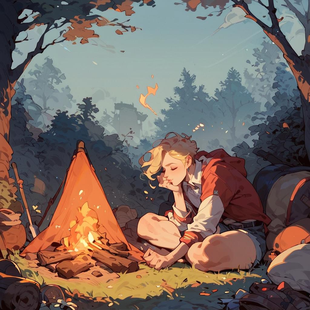 This is a digital drawing of a dark forest at night, split into two panels. In both panels, a person stands silhouetted by bright orange and yellow fires. The top panel shows large, intense flames with glowing embers, while the bottom panel has smaller, more contained fires. The forest is dense with tall, dark trees, creating a spooky, mysterious atmosphere.
