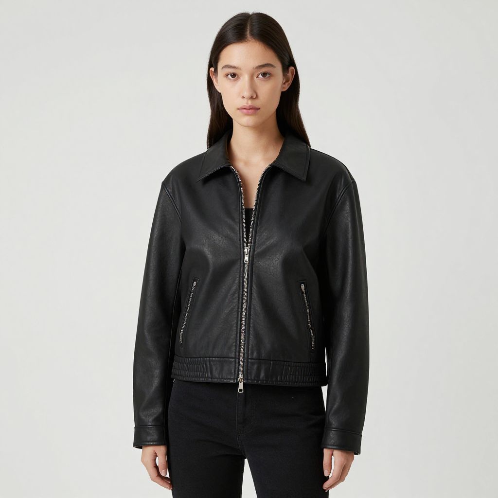 A young woman in a sleek black leather jacket