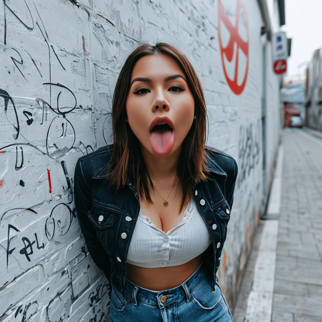 Bj-face-pose, (solo), 1girl, prostitute outfit, tongue out, standing, looking at viewer, oral invitation, medium-full shot, wall, street