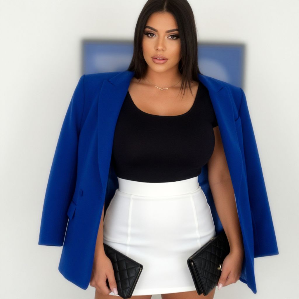 "Woman, chic, royal blue blazer with an open front and zipper details, black scoop neck top, white high-waisted mini skirt, black clutch with a quilted pattern, delicate gold necklace.. Sexy. Pretty face and beаutiful eyes. Big breasts."