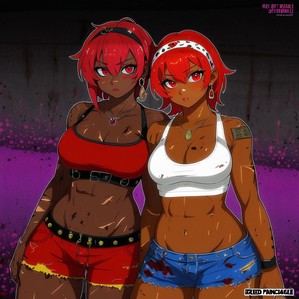 Digital anime artwork featuring two dark-skinned women with red eyes and short red hair. One woman wears a red crop top with red shorts and a black headband, while the other wears a white crop top with blue shorts and a white patterned headband. Both characters are showcasing toned midriffs, large to medium breasts, and wear earrings. The artwork is styled with a slightly gritty, rough aesthetic and vivid, contrasting colors.