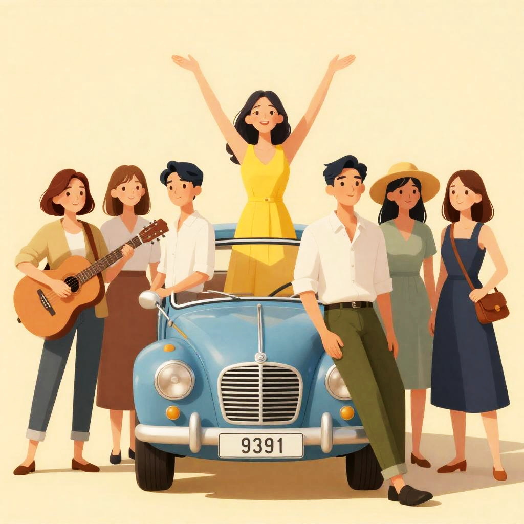 Digital illustration of seven people around a vintage blue car with yellow accents. Central woman with arms raised, wearing yellow dress. Left: two women, one with guitar, one in white blouse. Middle: two men, one in white shirt, green pants. Right: three women, one with sun hat, one in blue dress, one with brown purse. Yellow background. Car license plate "9391".