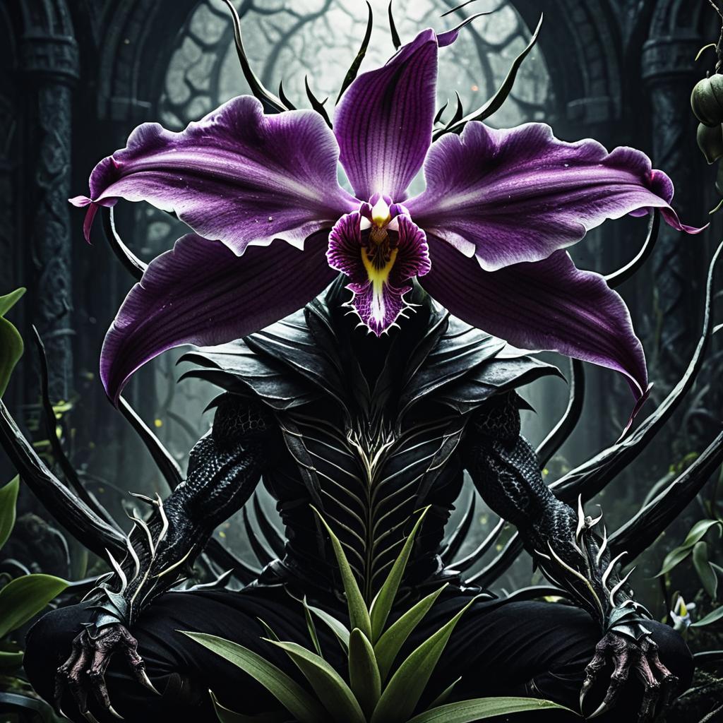Beautiful dark fantasy scene featuring a floating island with cascading waterfalls and a blossoming flower at the top from which an alluring mage emerges. High fantasy, highly detailed and visually striking