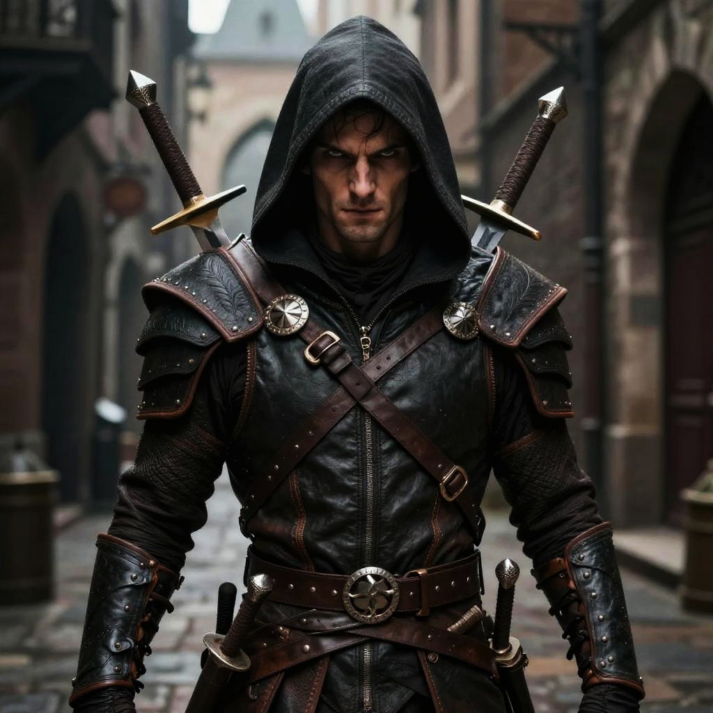 DND portrait creator depicting a cunning human rogue with dark leather armor, twin daggers drawn, a hood shadowing sharp facial features, urban medieval alley background, dramatic chiaroscuro lighting, rich detail in costume and expression