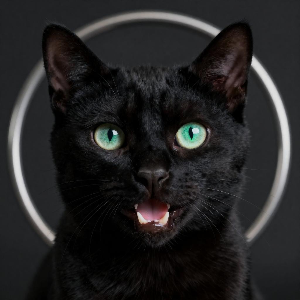 CGI image of a black cat with glowing green eyes and pink inner ears, set against a dark background. The cat's mouth is slightly open, revealing small fangs. A metallic, circular object is partially visible behind the cat. The cat's expression is surprised or curious.