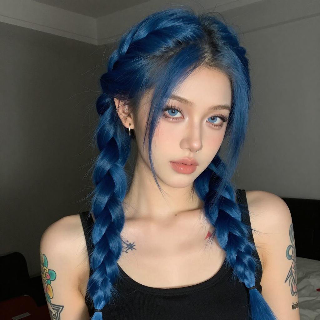 This is a digital portrait of a young woman with light blonde hair that fades into green and blue tips. She's wearing oversized, turquoise-rimmed glasses with black markings on them, and dark purple lipstick. Her blue eyes are wide and expressive. She has fair skin and a slight smile. The background is dark with a bright, blue-lit computer screen on the left.