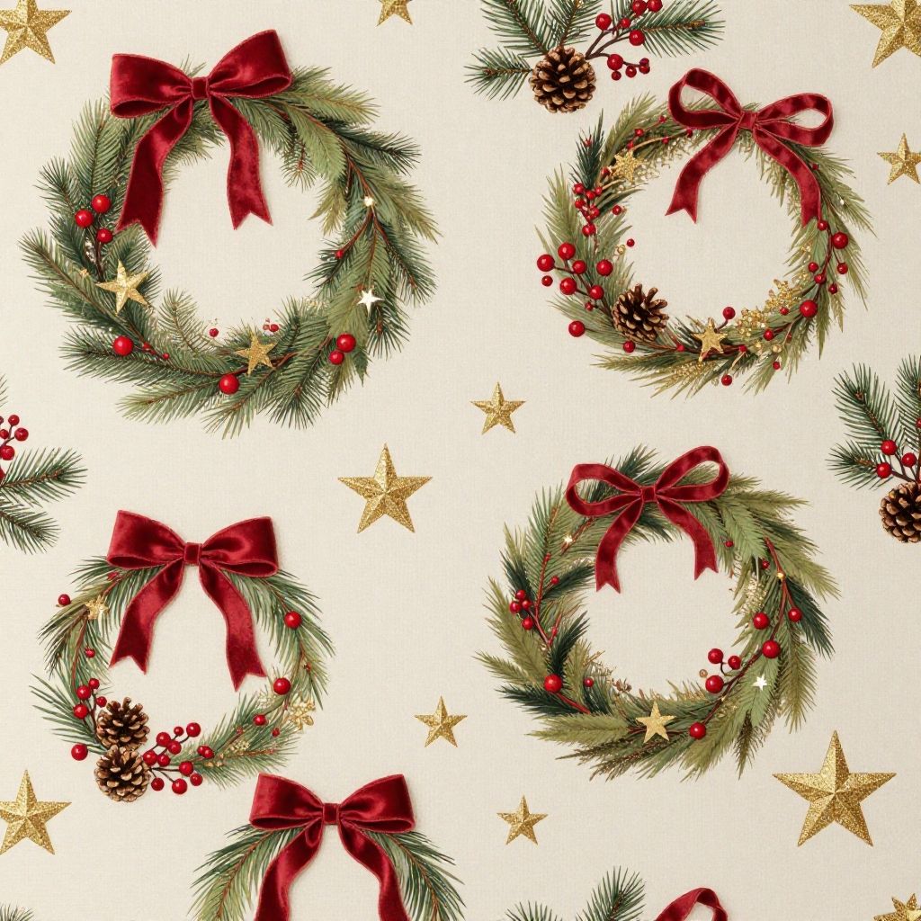Christmas matching wallpaper adorned with elegant gold stars, red berries, pine cones, and velvet ribbons intertwined with lush green garlands, designed in a luxurious, textured style to evoke warmth and festivity across walls or digital backgrounds.