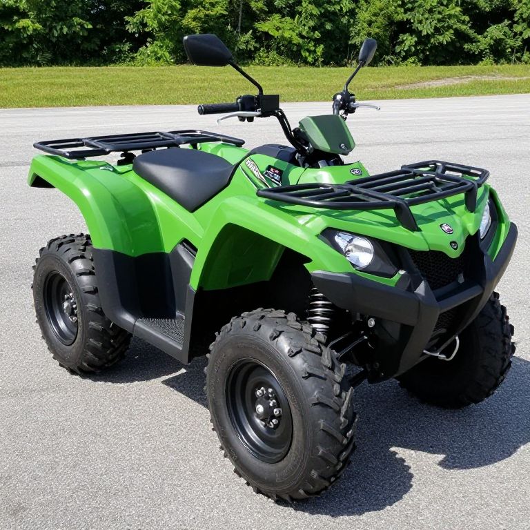 Photograph of a bright green, rugged all-terrain quad bike with large black tires, black seat, and black grille, parked on a sunny gravel