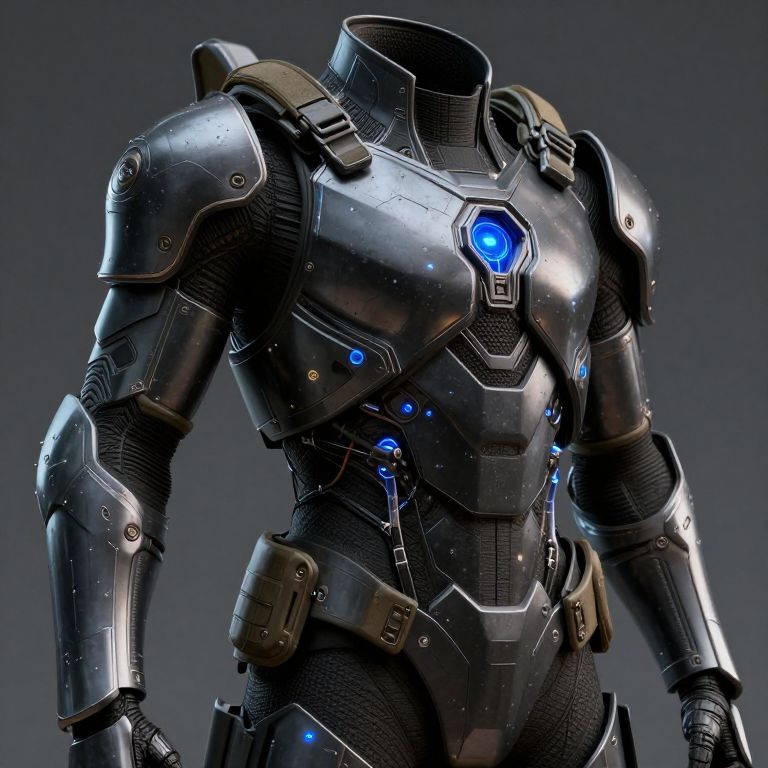 Photorealistic CGI image of a futuristic, metallic humanoid robot with a black, glossy armor plating. The armor features blue glowing hexagonal emblems on the chest and shoulders, and blue LED lights along the torso. The robot's design includes articulated joints and textured, grid-like patterns on the arms and legs. The background is a gradient of dark gray, highlighting the robot's sleek, futuristic appearance. The overall style is highly detailed and resembles advanced sci-fi armor.