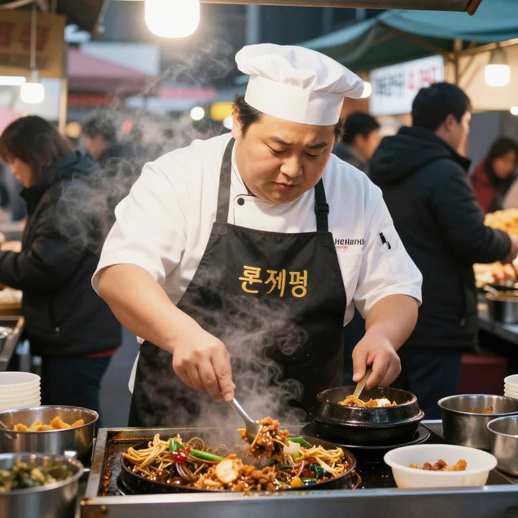 Chubby Korean chef cooking delicious street food in bustling market, authentic setting, steam and smoke effects, vibrant colors, focused expression, detailed textures on food and clothing