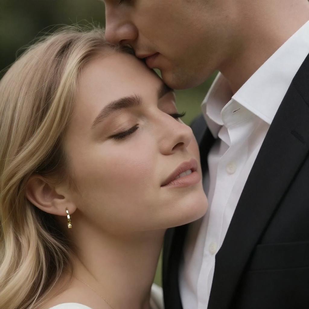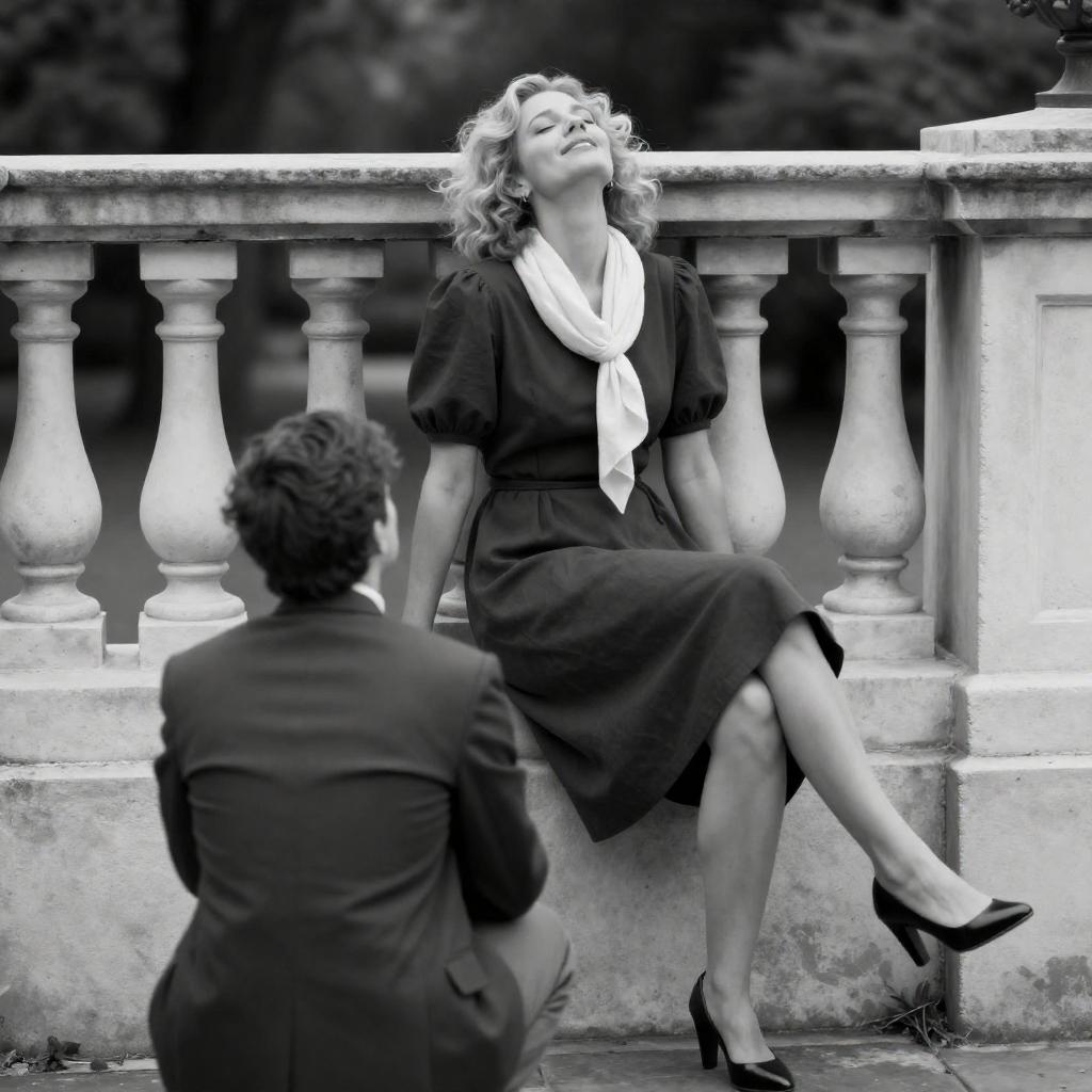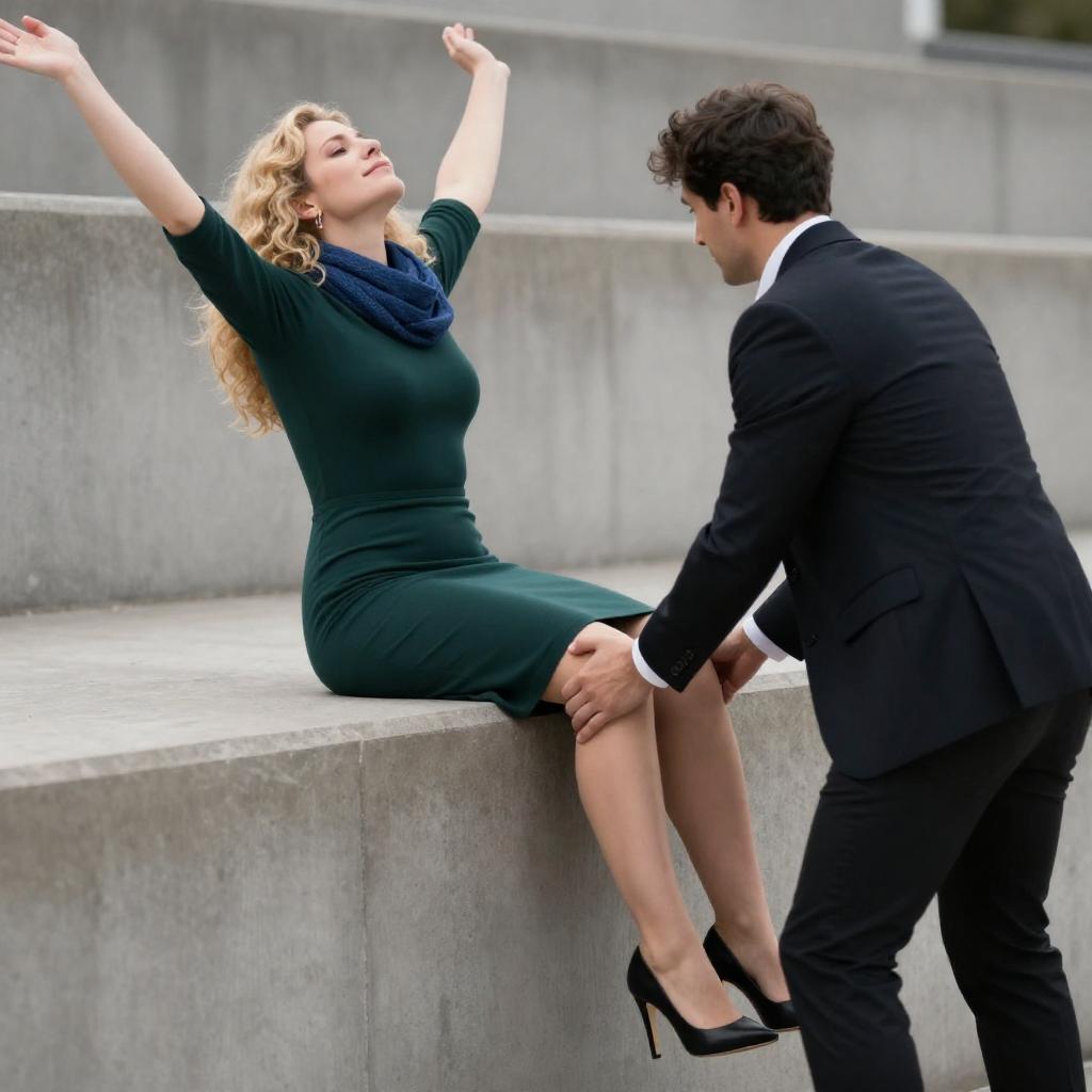 Photograph of a man helping a woman sit on a concrete ledge. Woman has curly blonde hair, blue scarf, dark green dress, and black high heels. Man has dark hair, black suit. Woman's legs dangle, man holds her ankles. Concrete ledge background, urban setting. Woman's head tilted back, arms raised.