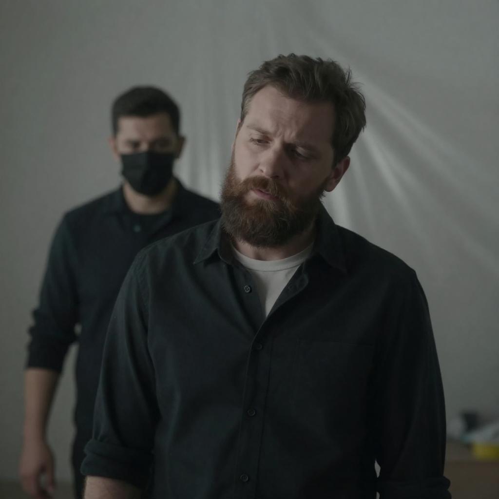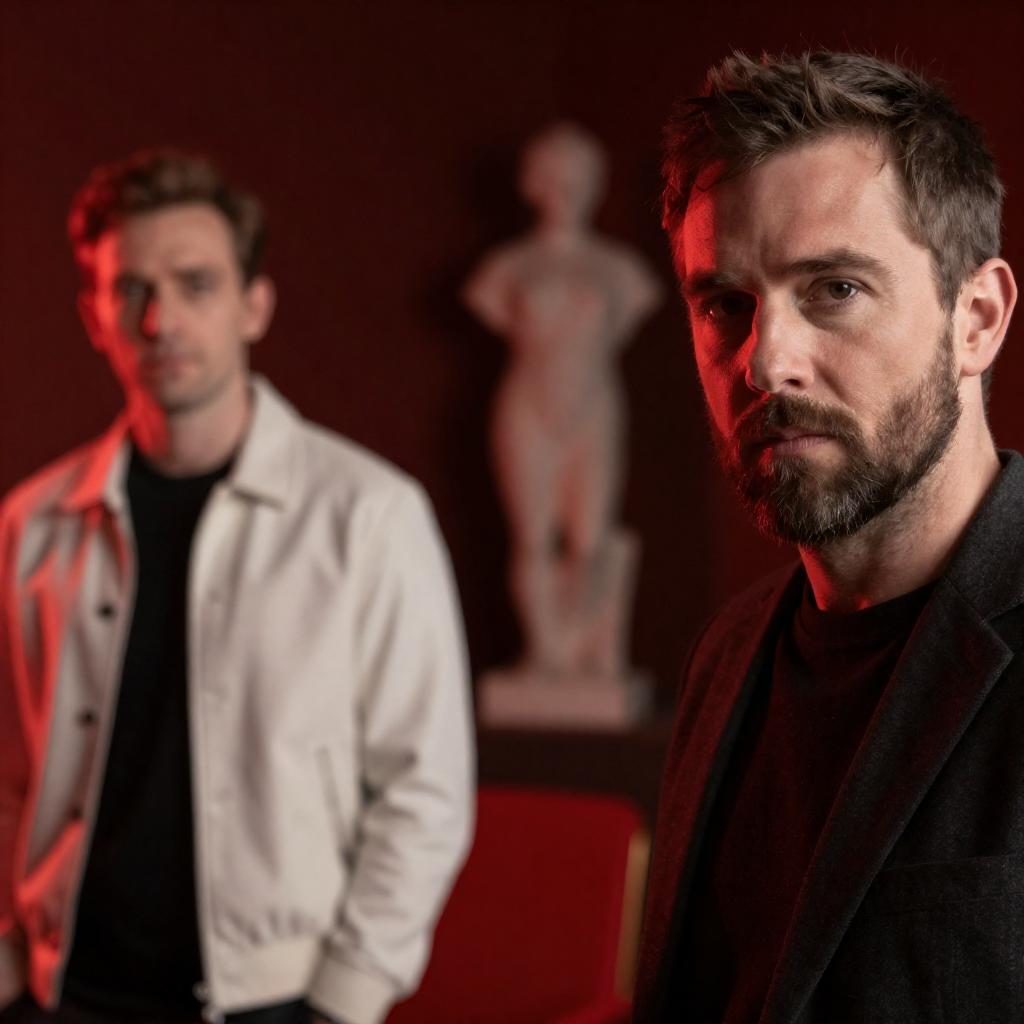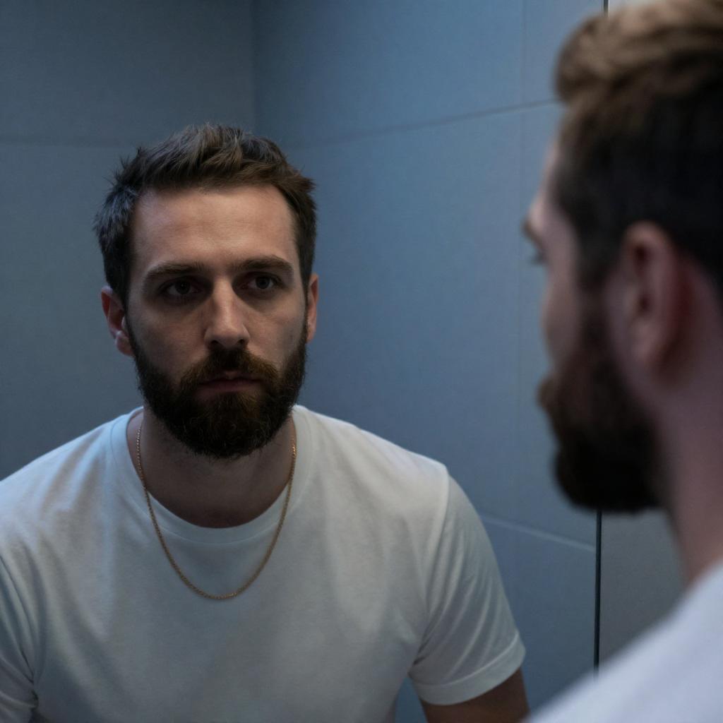 Photograph of a man with short brown hair and a beard, wearing a white shirt and gold chain, looking to the left in dim blue lighting. Reflected in a mirror on the right, same man's profile is visible. Background: tiled wall.