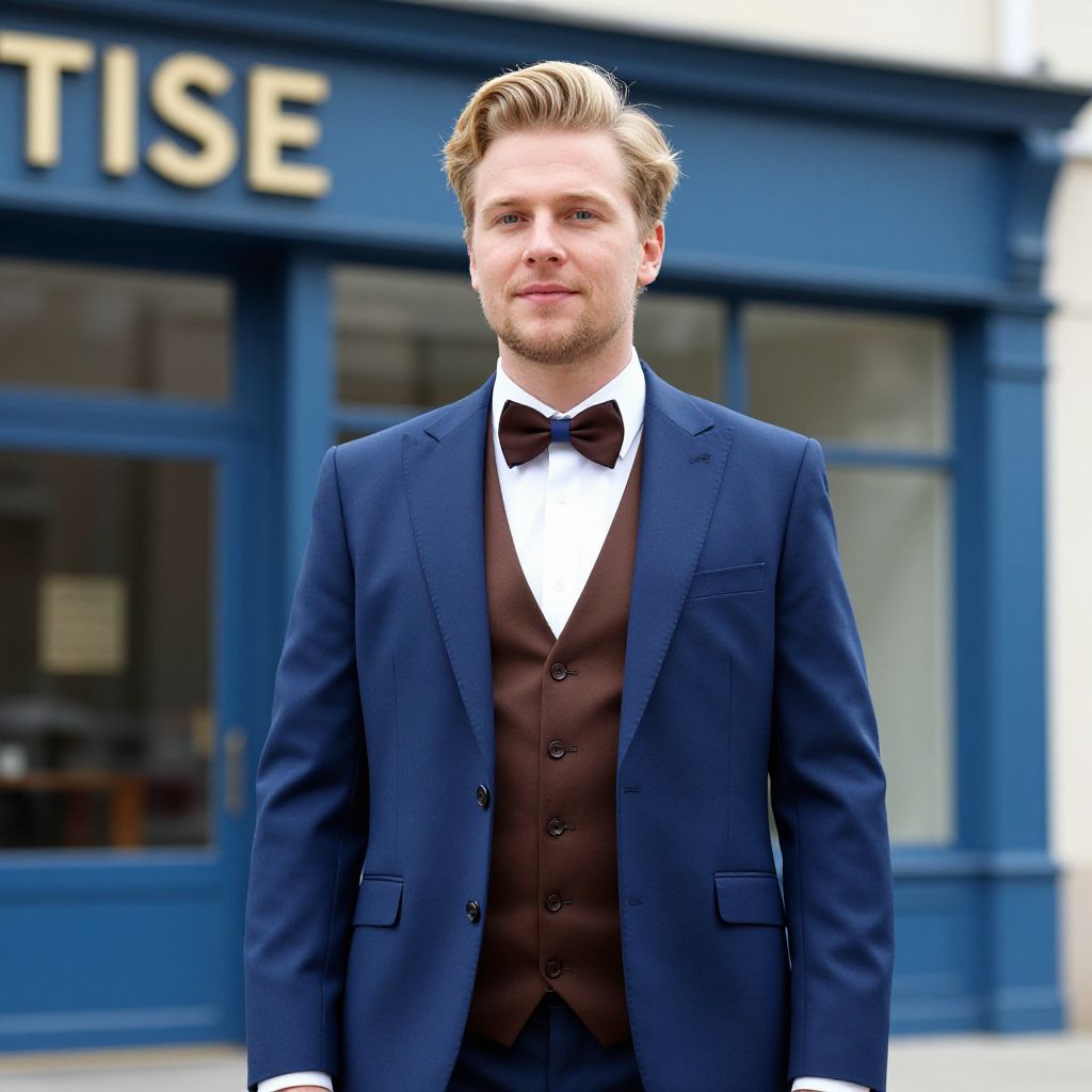 Man with blonde hair, wearing a blue suit with a brown vest and bow tie. He is standing in front of a blue building with a sign that reads 'TISE'.