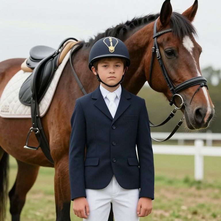Photograph of a young boy standing in front of a brown horse with a white stripe on its face. The boy, with light skin and dark hair, wears a navy blue equestrian helmet, navy blazer, white shirt, and white pants. The horse is equipped with a black saddle and bridle, standing on a grassy field with a blurred white fence in the background. The boy's expression is serious, and the image has a slightly over-saturated color effect.