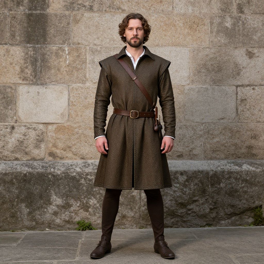 Photograph of a Caucasian man with wavy brown hair and a beard, standing against a weathered stone wall. He wears a dark brown, knee-length, textured medieval-style coat with a belt and a brown leather strap crossing his chest. Underneath, he has a white shirt with a high collar. He pairs this with black pants and black boots. The stone wall behind him has varying shades of grey and brown, with some moss growing at the bottom. His expression is neutral, and he stands with his arms slightly relaxed by his sides.