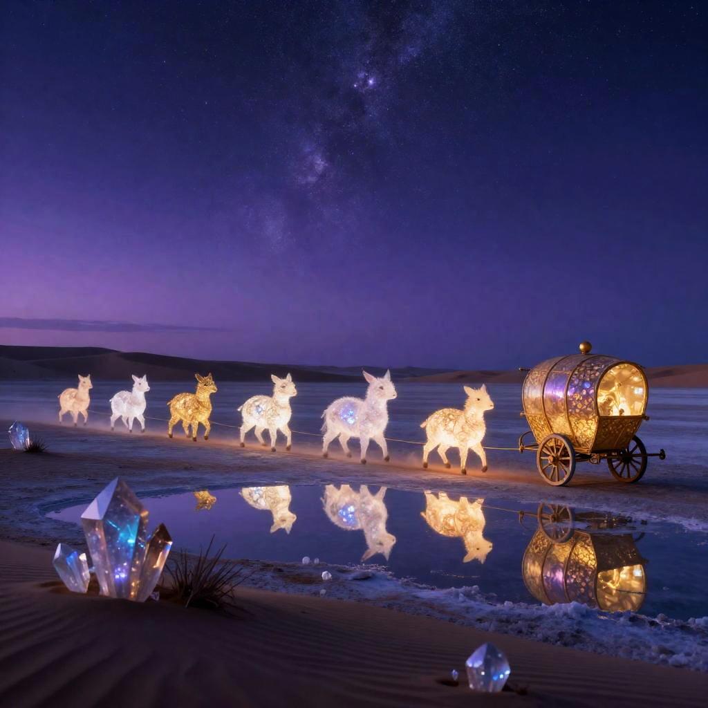A surreal twilight caravan of luminous creatures crossing a crystalline desert, featuring twilight purples with iridescent gold accents and showcasing shimmering crystal dunes and mirror-like salt flats reflecting a galaxy-streaked sky that blend nature's beauty with an imaginative twist.