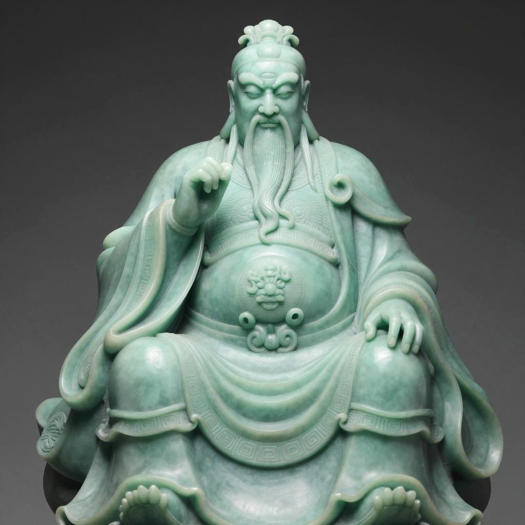 Detailed sculpture of a wise man carved from green jade, seated and draped in flowing intricately designed robes. The figure has a long flowing beard, a contemplative facial expression, and traditional ornamental patterns on the robes and belt. The sculpture evokes themes of wisdom, authority, and craftsmanship, set against a subtle dark background for emphasis.