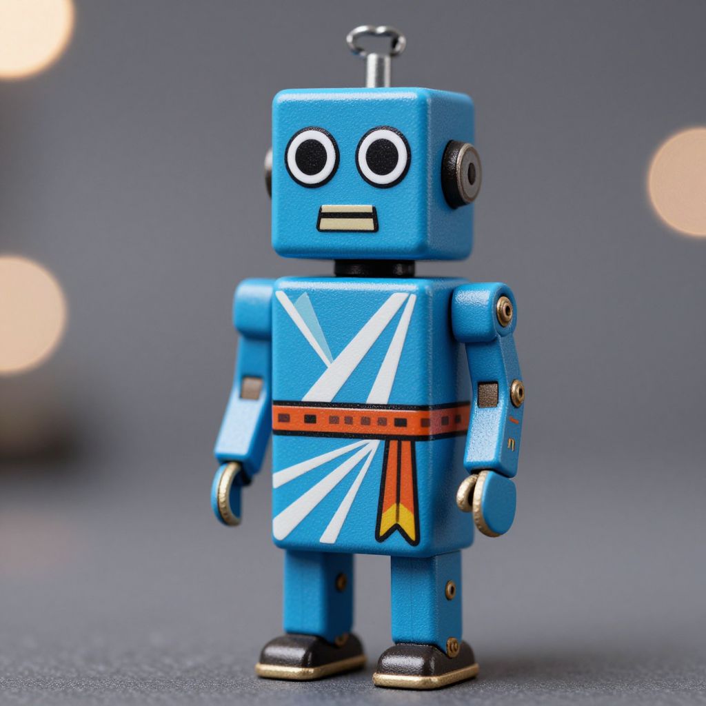 Photograph of a white, robotic, humanoid figure assembled from puzzle pieces, featuring blue eyes, red and yellow lights, and labeled "BUZZ."