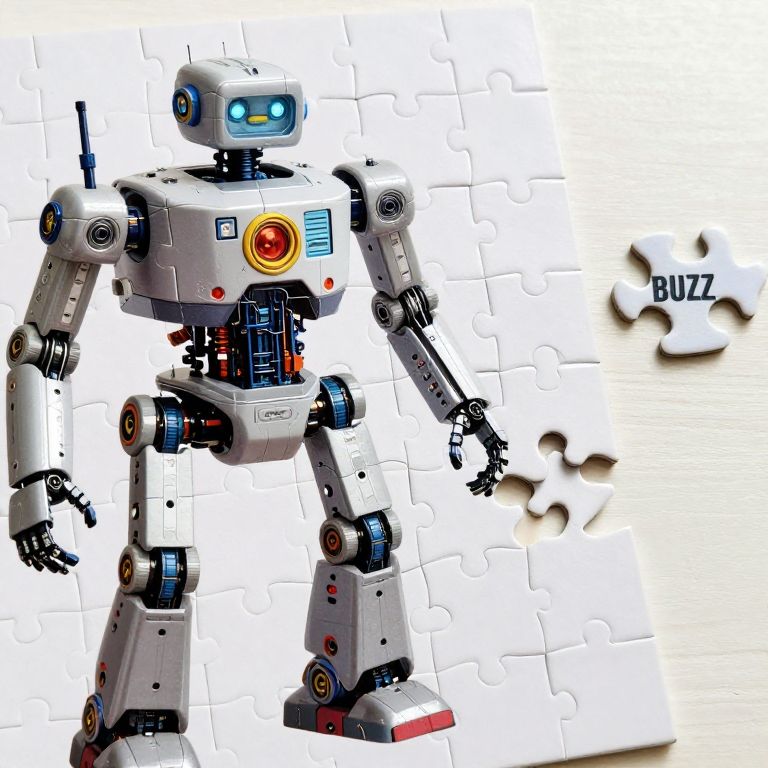 A photograph of a white, robot-shaped jigsaw puzzle piece standing on a white background composed of interlocking puzzle pieces. The robot has a blue, glowing eye on its head, a red and yellow circular sensor on its chest, and various mechanical joints and components in black and silver. Its arms are slightly bent, and it has a small antenna on its shoulder. The word "BUZZ" is partially visible on a puzzle piece to the right. The overall style is futuristic and robotic, with a clean, high-contrast color palette.