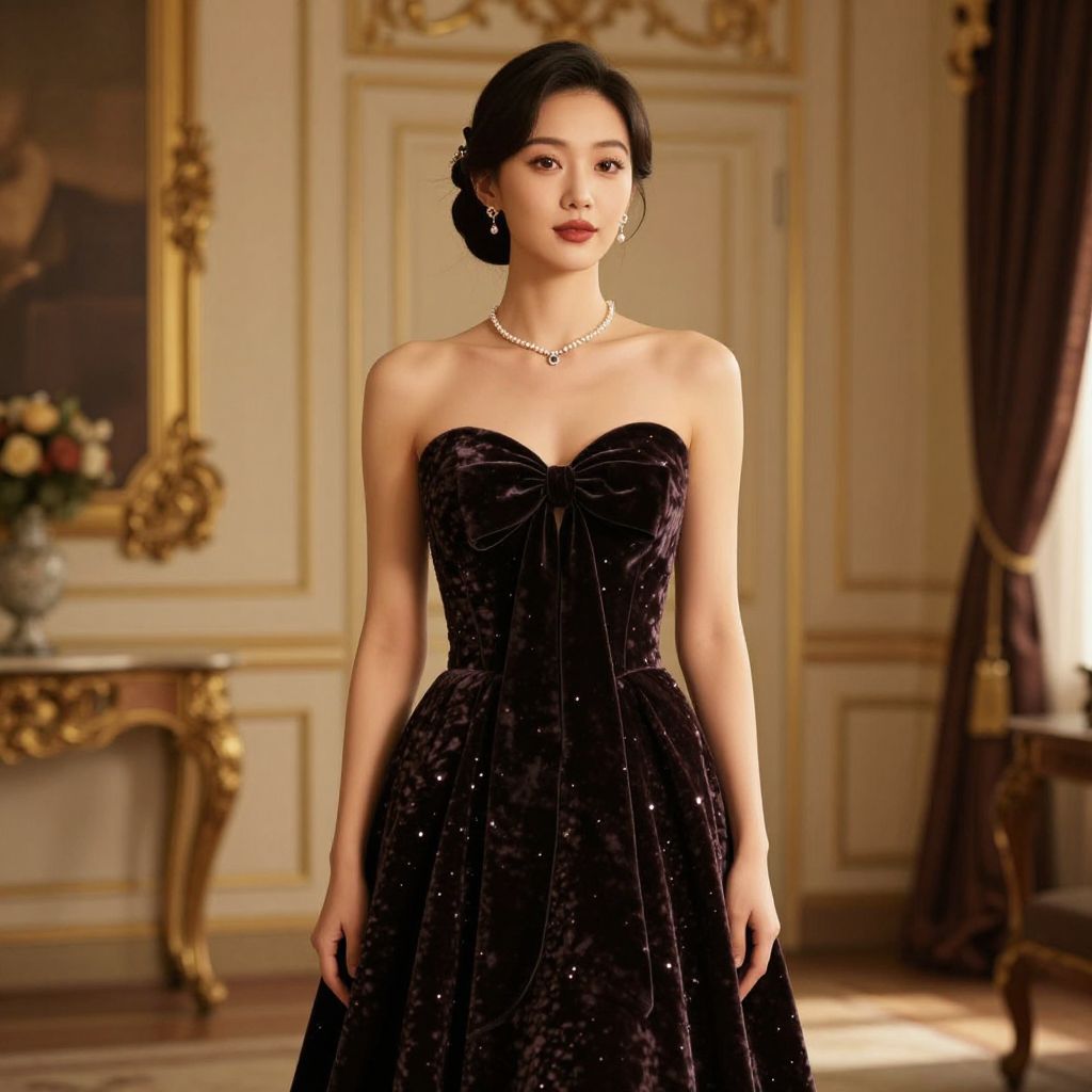 A woman elegantly adorned in a luxurious velvet gown featuring a prominent front bow, captured in a high-definition, cinematic style with warm, golden-hour lighting that enhances the opulent ambiance of the classic interior setting.