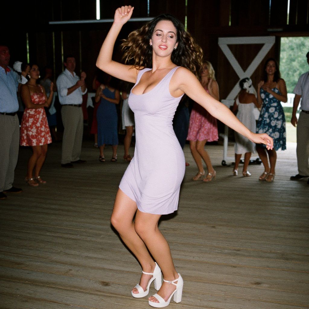 A voluptuous woman in a pastel lavender sleeveless shift dress with a scoop neckline and white ankle-strap platform sandals, captured in the visual style of 3M analog film stock. She is gracefully dancing on a wooden deck at a barn dance, her natural wavy hair flowing as she moves, embodying the joyful spirit of the celebration. Sexy. Pretty face and beаutiful eyes. Big breasts
