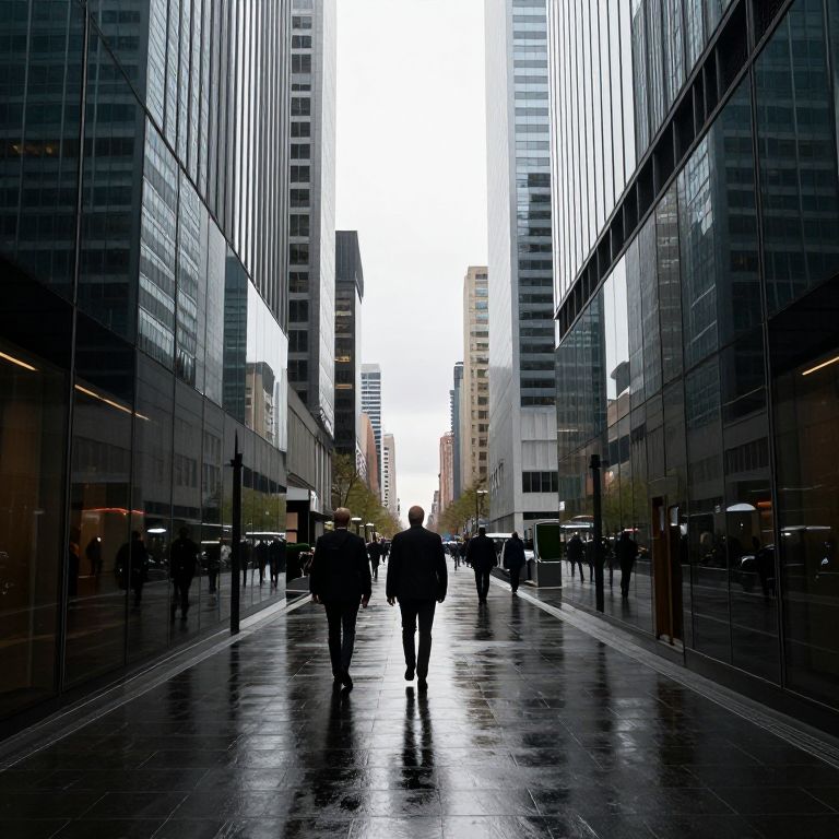 Reflective skyscrapers line a wet urban corridor, mirroring the silhouettes of suited individuals walking away, creating an endless illusion of parallel worlds converging into the horizon.