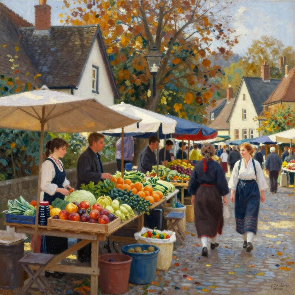 Sutherland village market scene in autumn, locals wearing traditional clothing, colorful fruits and vegetables on wooden stalls, cobblestone streets, warm sunlight filtering through trees, lively and nostalgic atmosphere, impressionist art style