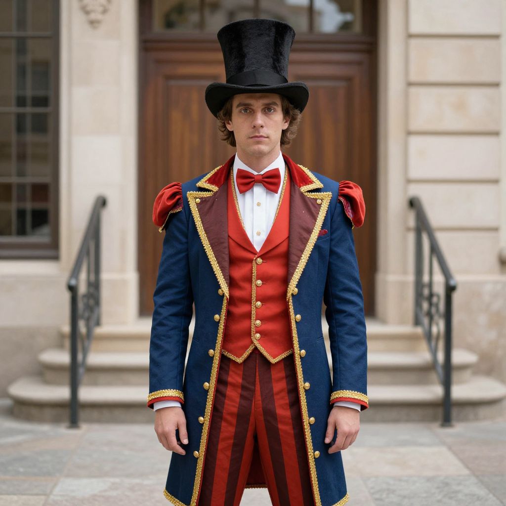 Photograph of a young man standing in front of a grand building with a wooden door. He has wavy brown hair, pale skin, and a serious expression. He wears a tall black top hat, a navy blue coat with gold trim, red waistcoat, red striped trousers, and a white shirt with a red bow tie. The coat's shoulders are adorned with red fabric. The background features stone steps with black railings. The image is brightly lit, highlighting the vivid colors of his attire. The style is reminiscent of 19th-century theatrical costumes.